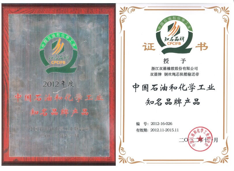 雙箭牌輸送帶被評為2012年度中國石油和化工行業知名品牌產品