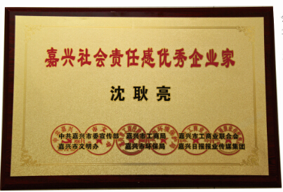 5月28日,在以“責任引領未來 共建誠信嘉興”為主題的嘉興市首屆“最具社會責任感企業(家)頒獎典禮上,一年多來,通過大眾網絡、報紙投票和組委會評議,認真篩選,層層選拔,最終誕生的嘉興最具社會責任感的企業和企業家以及優秀企業和企業家各10名受到了表彰。我公司董事長沈耿亮也獲此殊榮。